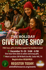 A warm, joy-filled holiday experience hosted by A Mindful Resource, Inc., where families facing hardship can select gifts, essentials, and wellness items at no cost—with dignity, care, and love. Families will arrive during their scheduled time, step into a cozy, festive space, and “shop” for items that bring comfort and joy—completely free. Our goal: no family feels forgotten this holiday season.